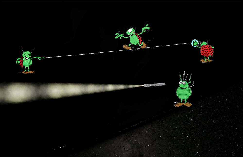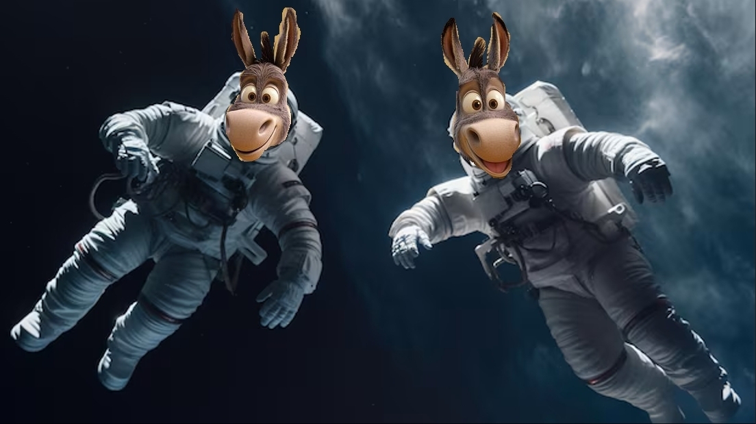 A gauche :"_ Z'avez vu ? Il est cool mon scaphandre ! Devinez d'où il vient."A droite :"_ Raaah, mais c'est pas vrai, ils ont acheté le mien chez SpaceX !"