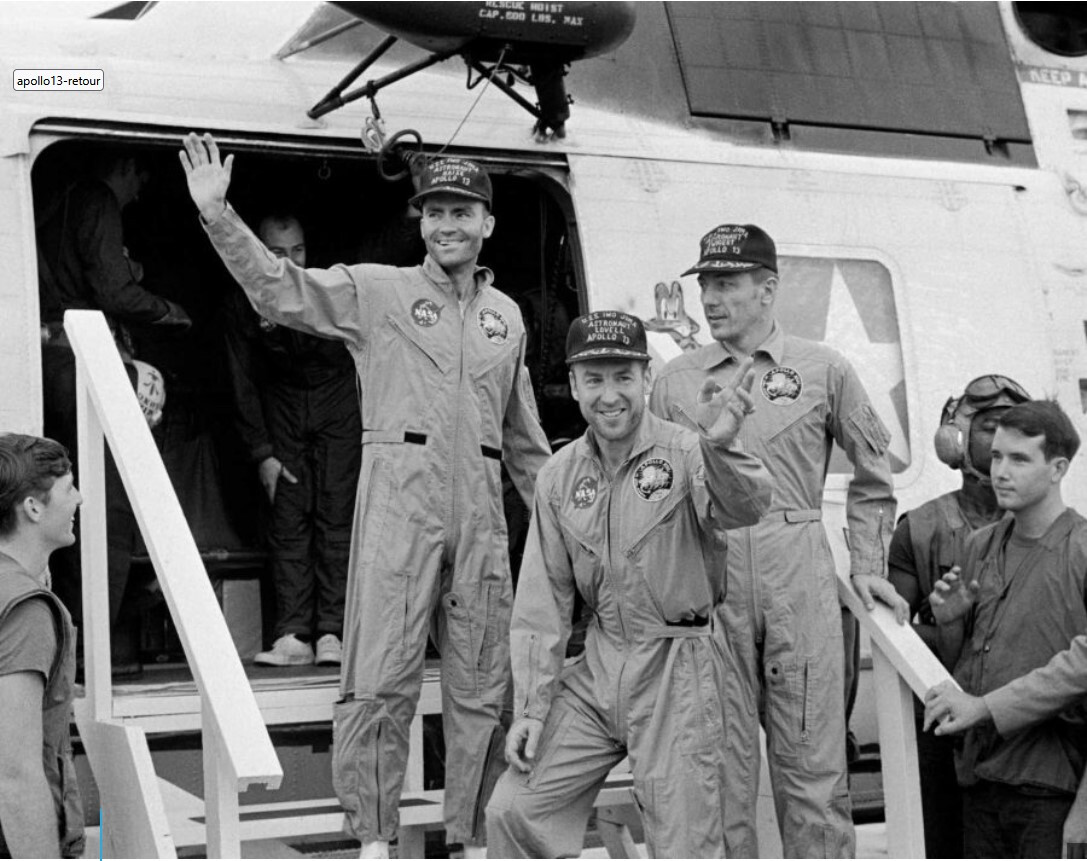 Arrivée de l'équipage d'Apollo 13 à bord du navire d'assaut amphibie USS Iwo Jima (LPH-2)."En apparence, la mission était vouée à l’échec. Mais l’attitude positive de l’équipage et du centre de contrôle a fait de ce qui allait être une catastrophe, un sauvetage réussi", s’était rappelé Jim Lovell.