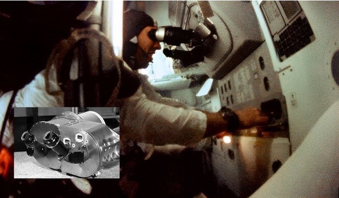 A bord d' Apollo 8, James Lovell fait le point en déterminant la positions des étoiles à l'aide du sextant (visible dans l'image incrustée).Lovell effaça involontairement une partie de la mémoire de l’ordinateur de bord en y insérant des données erronées ce qui eut pour effet de donner via l’Unité de Mesure Inertielle (IMU) au CSM une mauvaise orientation en attitude. Une fois que l’équipage comprit le problème, Lovell trouva les données correctes en orientant le CSM pour aligner avec le sextant des étoiles choisies puis il les inséra dans l’ordinateur de bord, tout cela en moins de trente minutes.