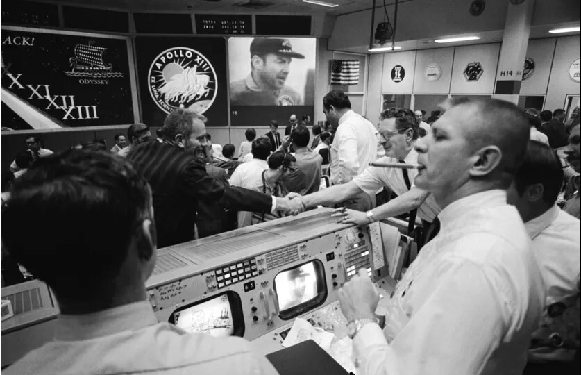 Moments de joie au centre de contrôle de la Nasa à Houston en communication avec Jim Lovell après l'amerrissage réussi d'Apollo 13 le 17 avril 1970.