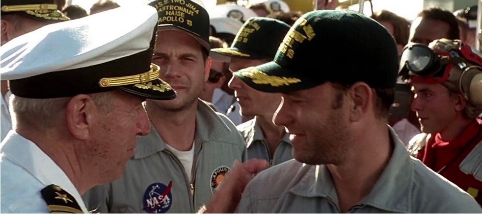 Image extraite du film de Ron Howard "Apollo 13" :James Lovell dans son uniforme d'officier de Marine est avec l'acteur Tom hanks qui joue son son rôle.