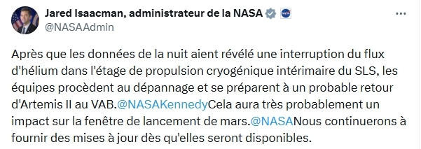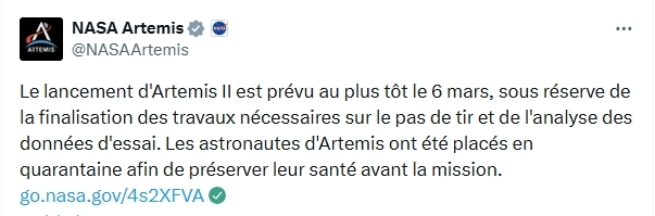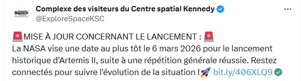 Suite à la conclusion aujourd'hui de la répétition générale en conditions réelles, nous abandonnons la fenêtre de lancement de février et visons désormais mars pour le lancement d'Artemis II le plus tôt possible.