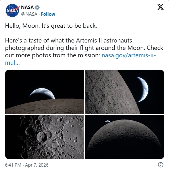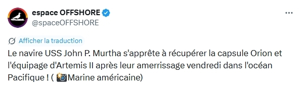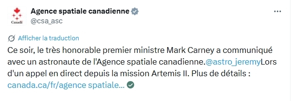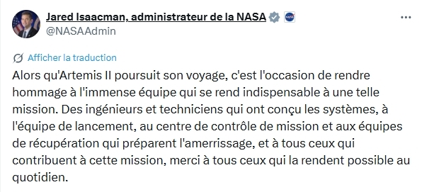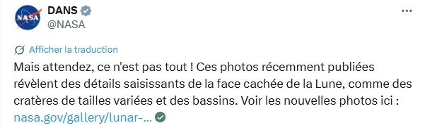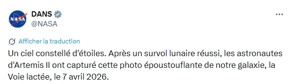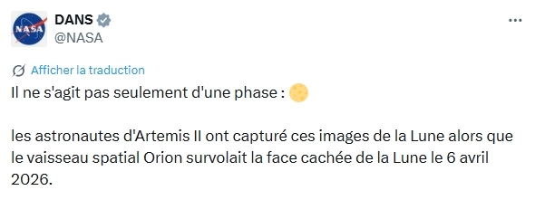 J'avais fait la mission Artemis II il y a quelques semaine sous Orbiter en prenant en compte un lancement le 1er avril.J'avais alors pris cette capture à 25 min avant le closest approach.Voici la photo prise par l'équipage d'Artemis II.Je suis scotché par la ressemblance du résultat.Nul doute que les ingénieurs de la NASA ont utilisé Orbiter pour planifier la mission.