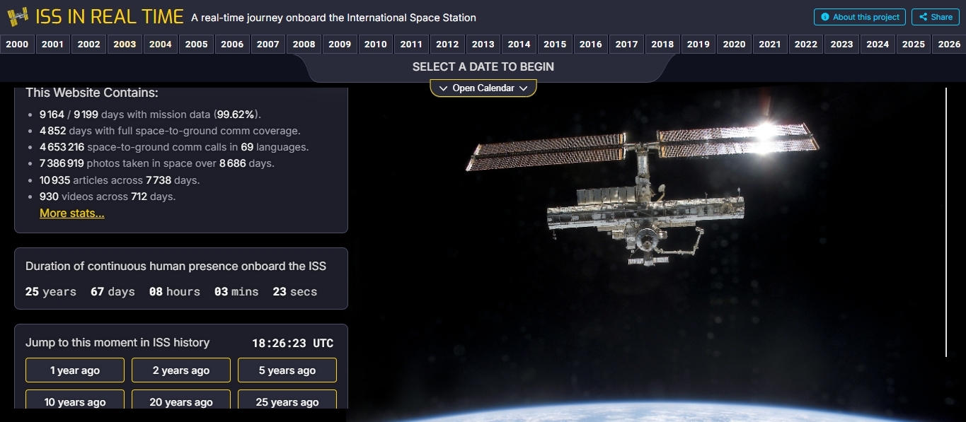 « ISS en temps réel » est un projet multimédia qui retrace les 9 131 jours (et ce n'est pas fini !) passés à bord de l'ISS depuis sa première occupation. Nous utilisons pour cela les données et contenus que la NASA publie depuis toutes ces années, mais nous les présentons d'une manière unique en les replaçant dans le contexte de la mission, au fur et à mesure du déroulement des événements.